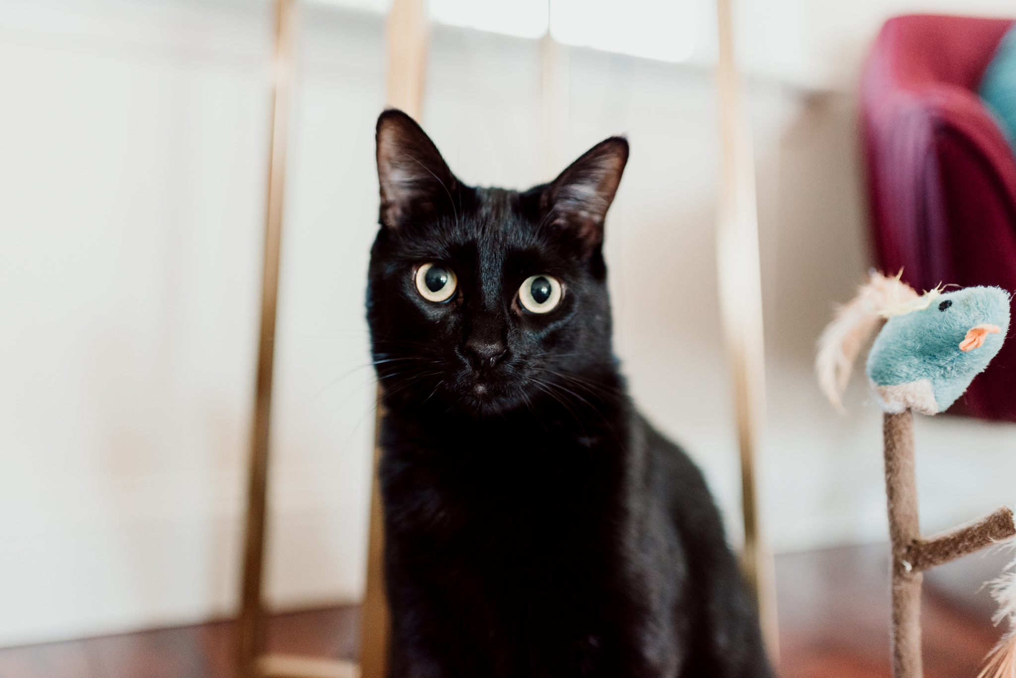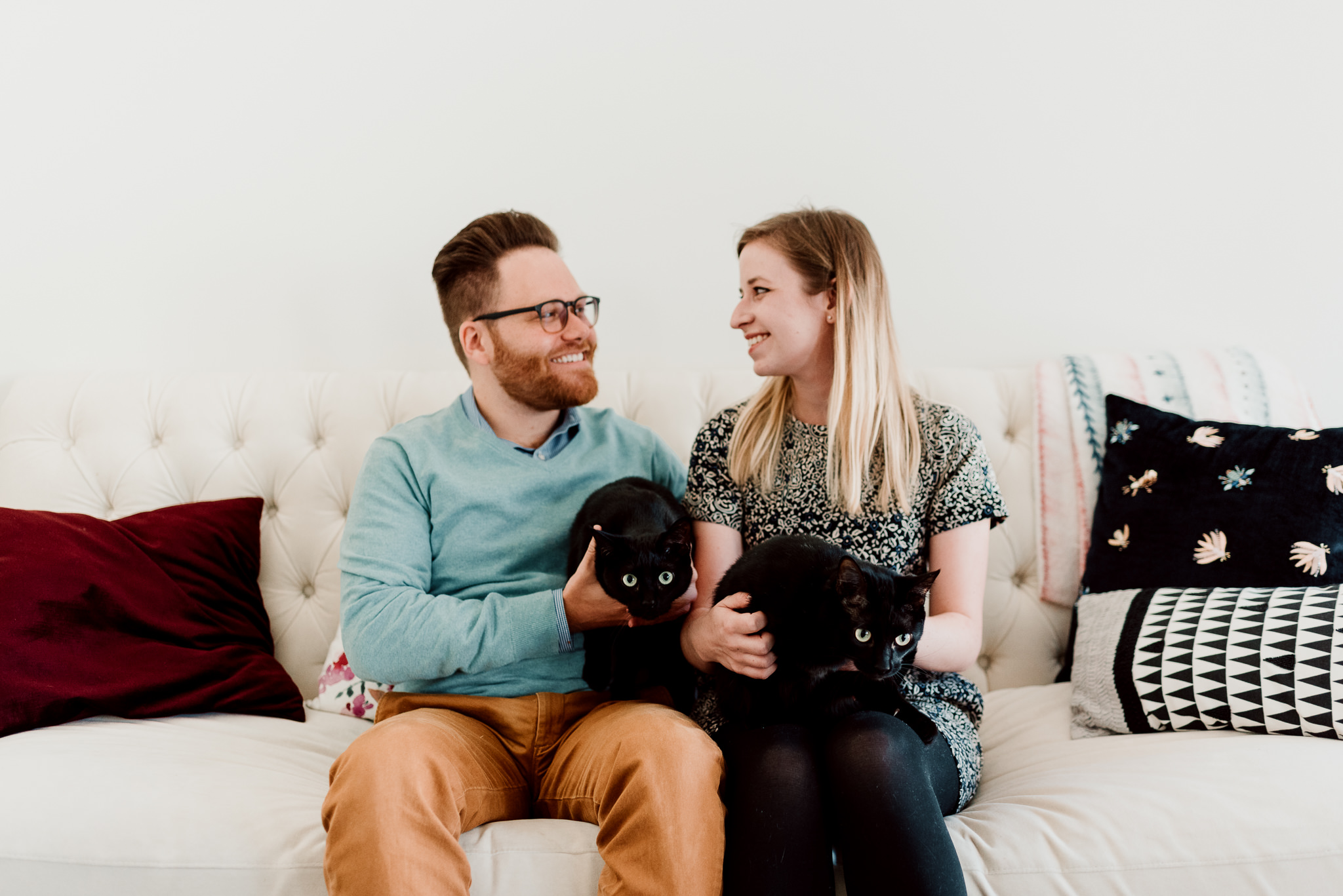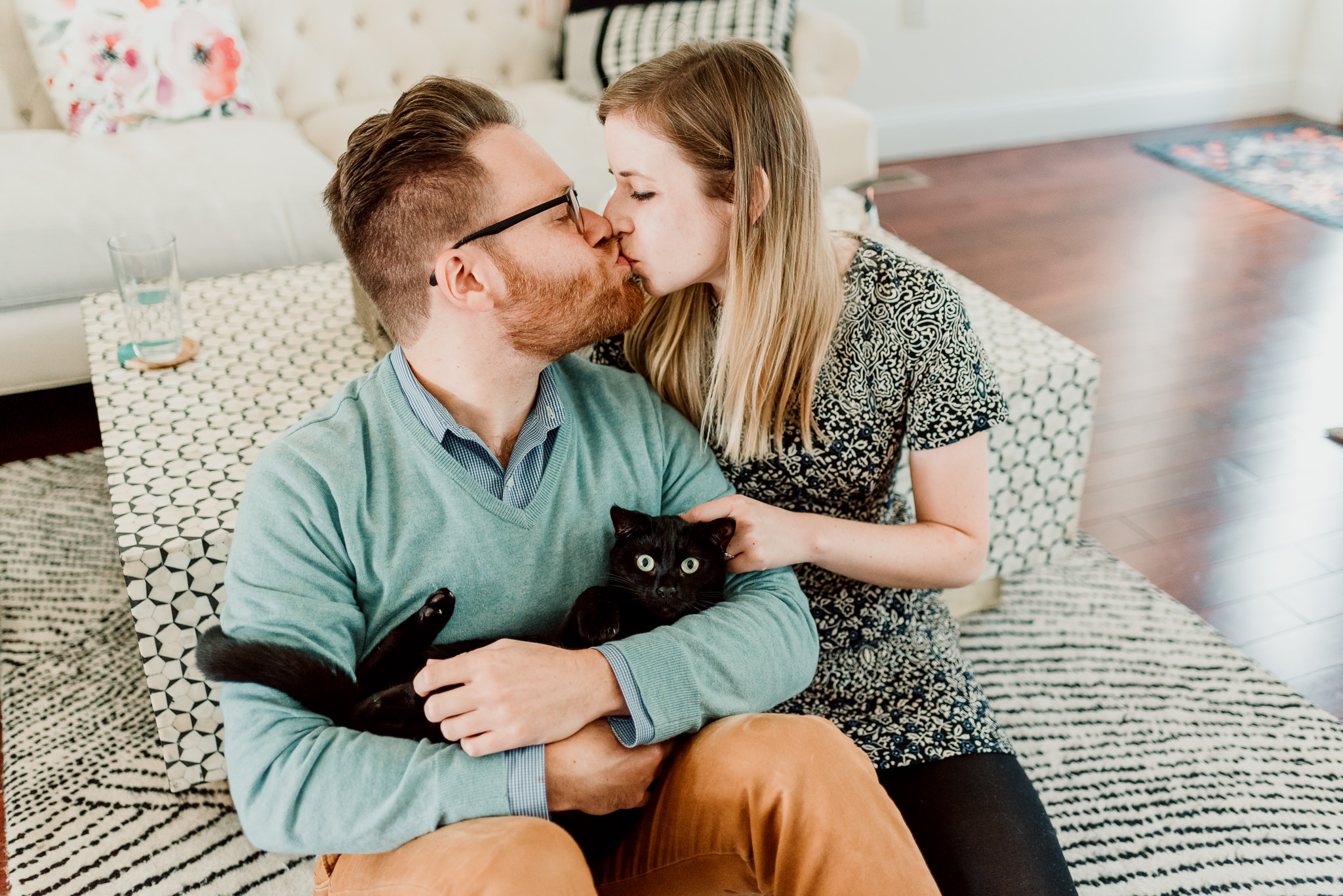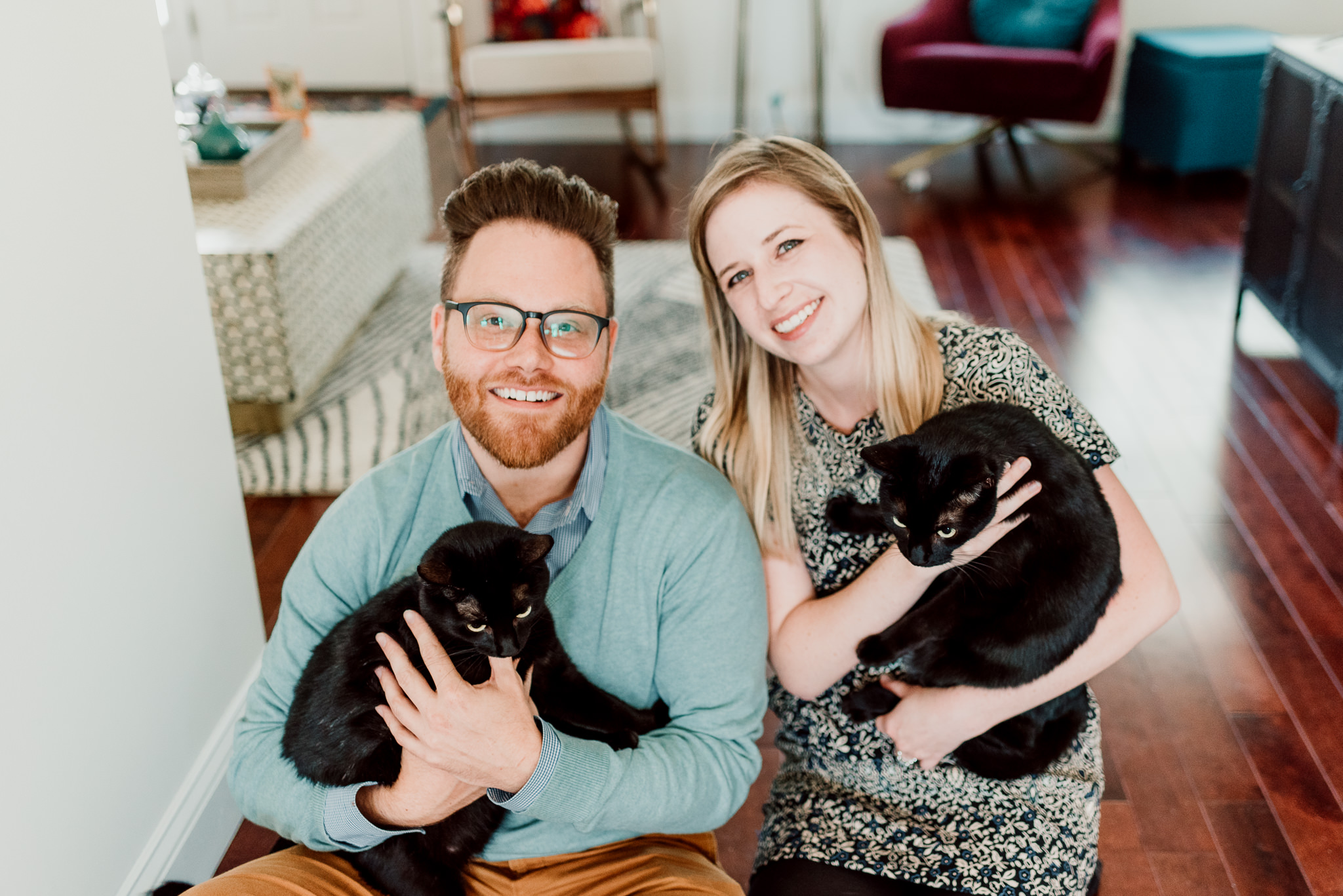 Fun story: Dana + Joel wanted to keep things low-key for their engagement session, and we were tossing around ideas for something comfy and genuine and just… “them”, you know? Then they mentioned their two black cats being basically the loves of their lives, and I was like DUDE CAN WE SHOOT IN YOUR HOME WITH YOUR CATS?! And they got excited, and so that’s exactly what we did, and it was awesome.