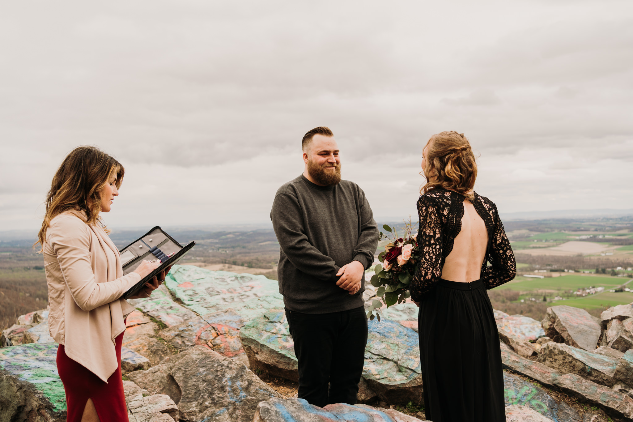 We met up with Ali, my long time friend and officiant at the bottom of the hiking trail and made our way to the lookout. The skies were misty and soft clouds filled the valley underneath us when we got to the lookout. There wasn’t a soul around. Ali had written a custom ceremony just for them. They read their hand-written vows to each other and there were tears and laughter and it was STUNNING. After a few portraits over the mountains, we all hiked down and they danced in the trails along the way, beaming with all the love and joy you could ever imagine.
